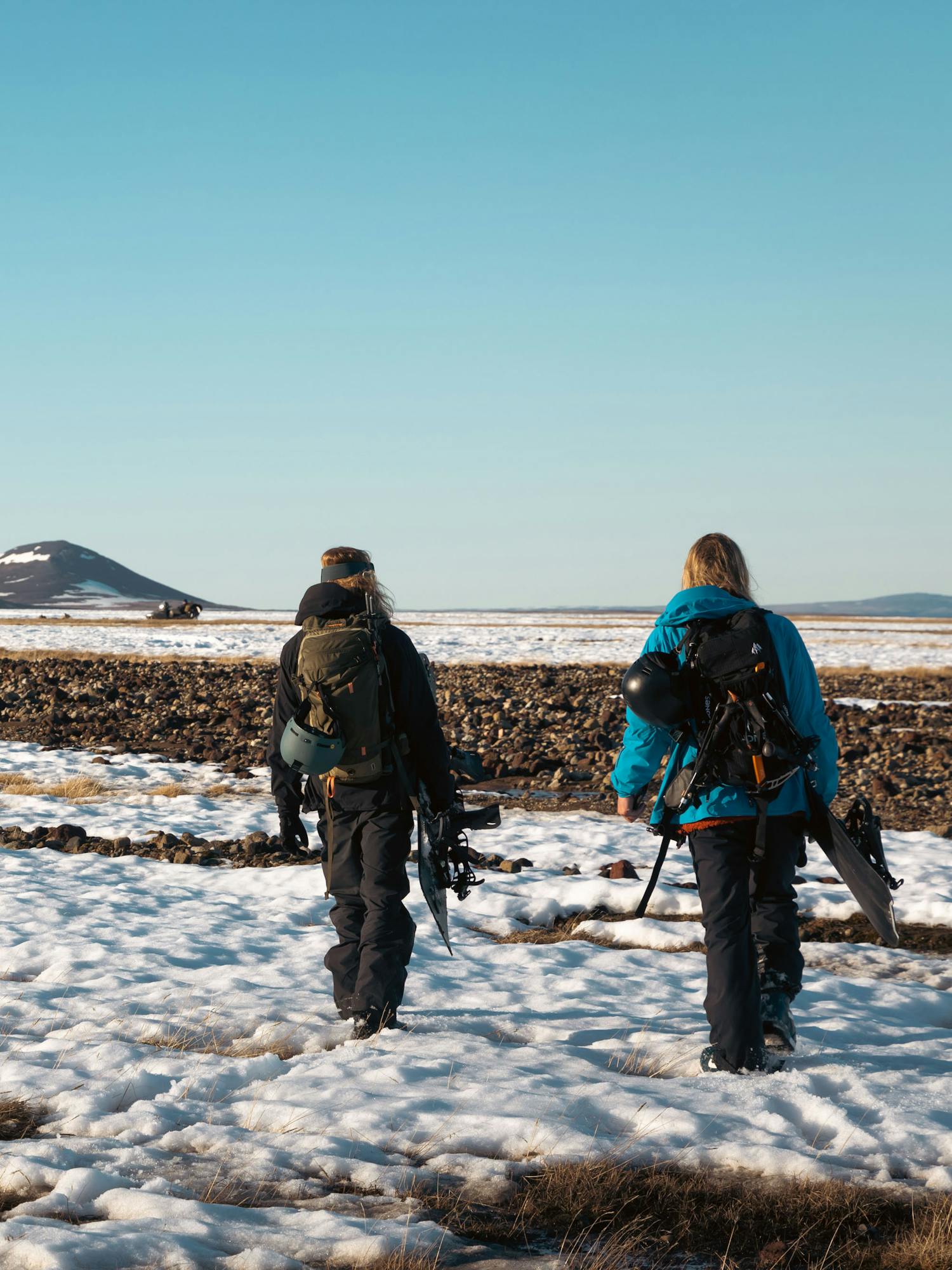 The roots of the mountain are ONLY accessible from mid-summer into early fall. The rest of the year you need to prepare well and reserve time and resources just to be able to reach the mountain. As was the case for us. With no roads open yet to get to the base of the mountain we had to cross 5 km. of open plain with rugged terrain mostly covered in snow with rivers, creeks, and ponds appearing from under the winter frost all around, with all the gear required for a weekend of safe riding and camping in the Icelandic highlands. The gear required for a trip like this, even for just two nights, quickly adds up. Splitboard equipment for 4 people, camping gear, clothes for all possible conditions, avalanche and safety equipment, food, cooking equipment, and so forth.