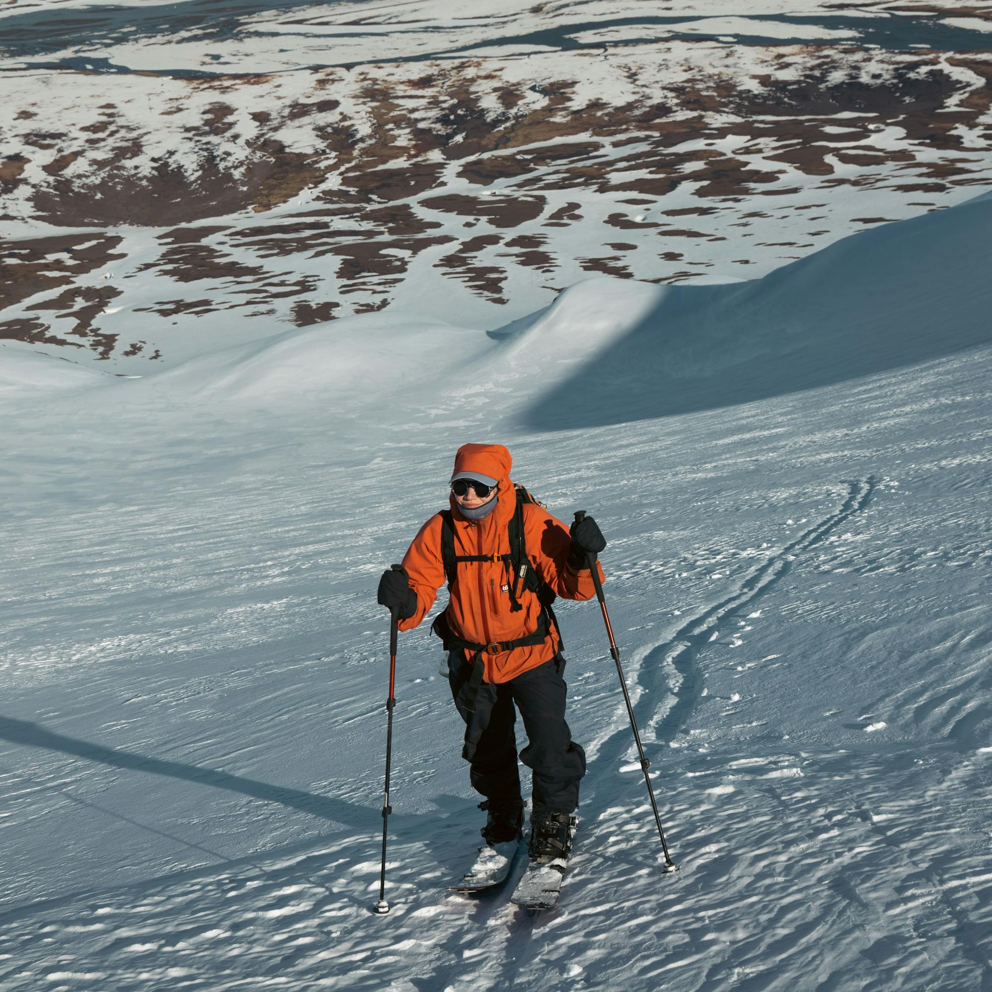 Sunday morning we wake up again to the glaring sun and heat. Excited to get going, we prepare and start skinning up the mountain. We are aiming for a new line today but we hike up the same way as the day before, with beautiful views southwest over Vatnajökull. It’s only at the end of our hike when we cross over a ridge and reach the starting point of our line that we see southeast over our camp and the seemingly endless snowy plains we traveled across only two days before. To our horror, it now looks like a seemingly endless plain of rivers, creeks, ponds, lakes, and mud and very limited snow left. We have 4 km of plains to navigate with our gear.