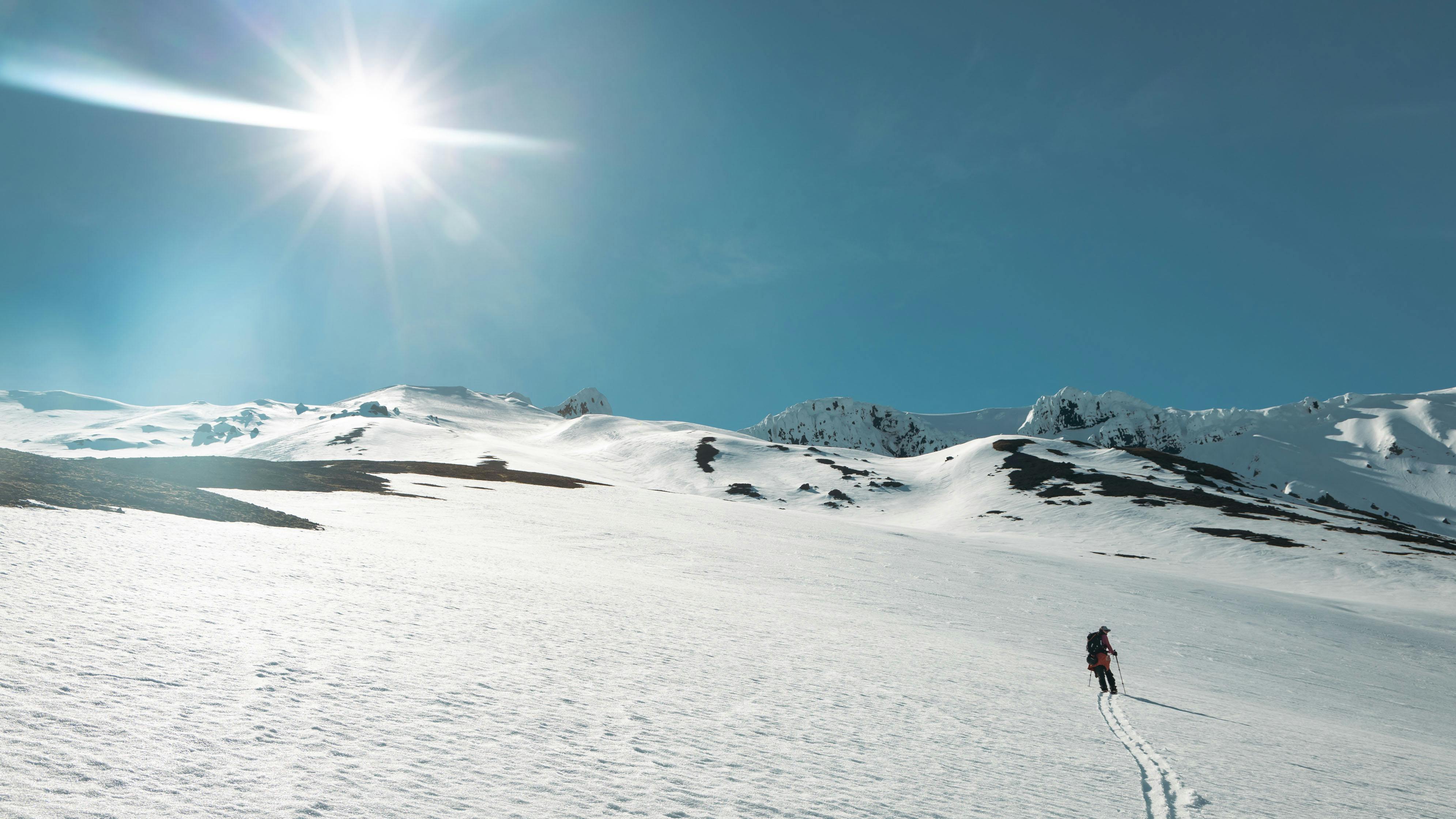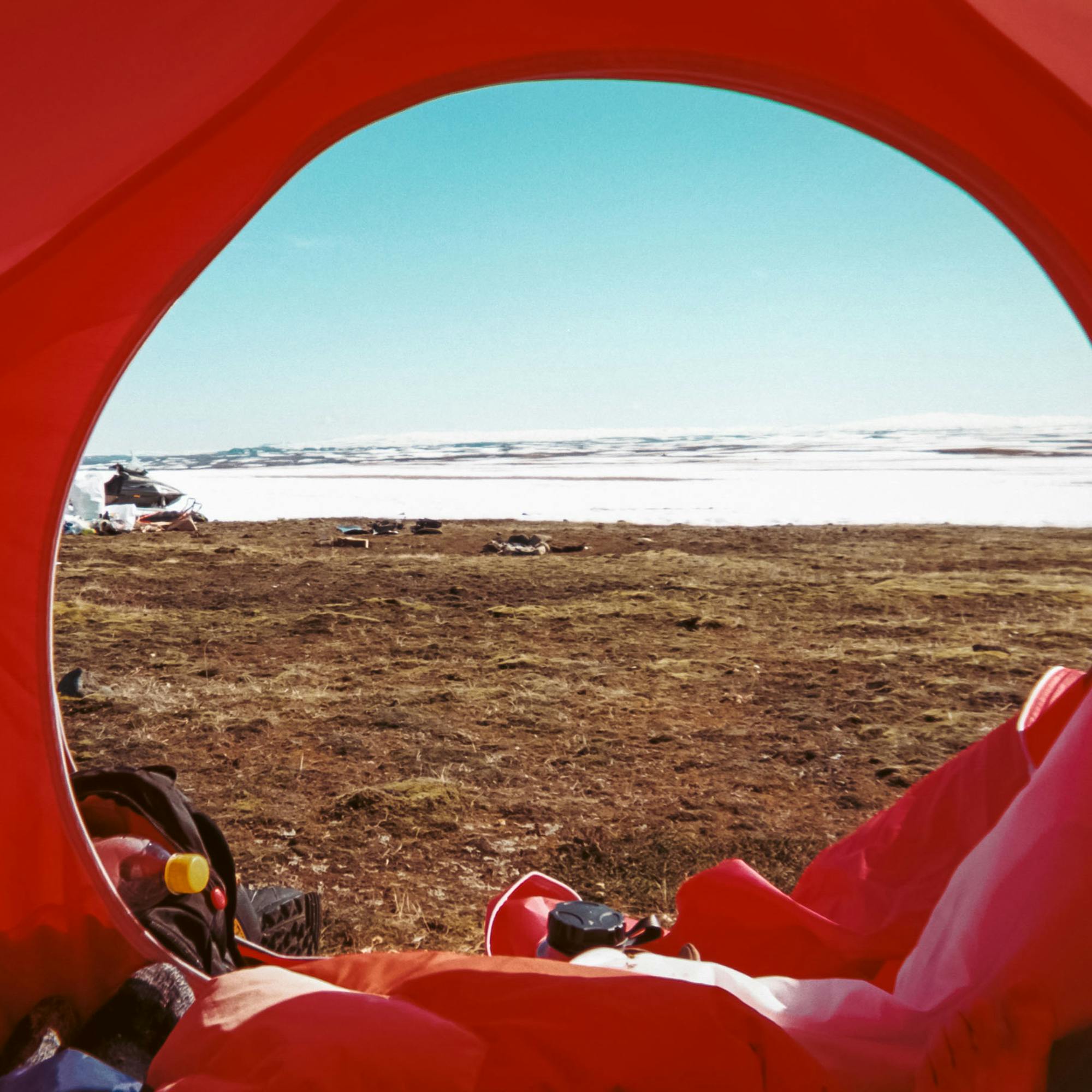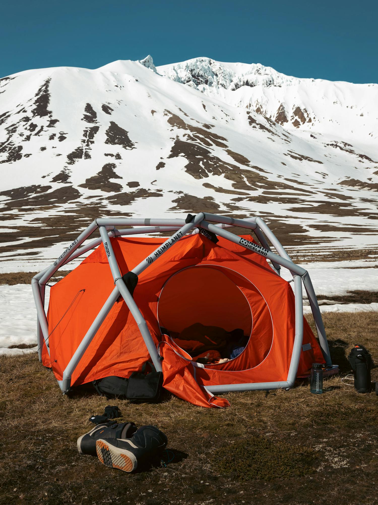 Friday night. We arrive in rather wet and foggy conditions, set up camp, and quickly go to our sleeping bags to reserve energy for the days to come. Saturday morning at around 7 am. We slowly wake up soaking in sweat in our 4 season sleeping bags, but remarkably moderate temperature inside the tent. The 66°North x HEIMPLANET tent already proved its worth by keeping us dry on the humid night before and the temperature mild in the morning when we woke up to not a single cloud in the sky and the sun scorching us and everything around us. The air temperature was close to 15°C already, remarkably high for this part of the country and 700 meters above sea level. Summer had hit overnight. As our eyes slowly adjusted the glaring brightness of the sun, Snæfell towered above us in all its glory! We had no time to waste. Eat food, prep snacks for the backpacks, screw splitboards together, check safety gear, and a lot of sunscreens and off we went.